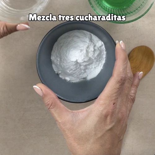 En un bowl, mezcla tres cucharaditas de bicarbonato, tres cucharaditas de agua oxigenada y tres cucharaditas de jabón para trastes.